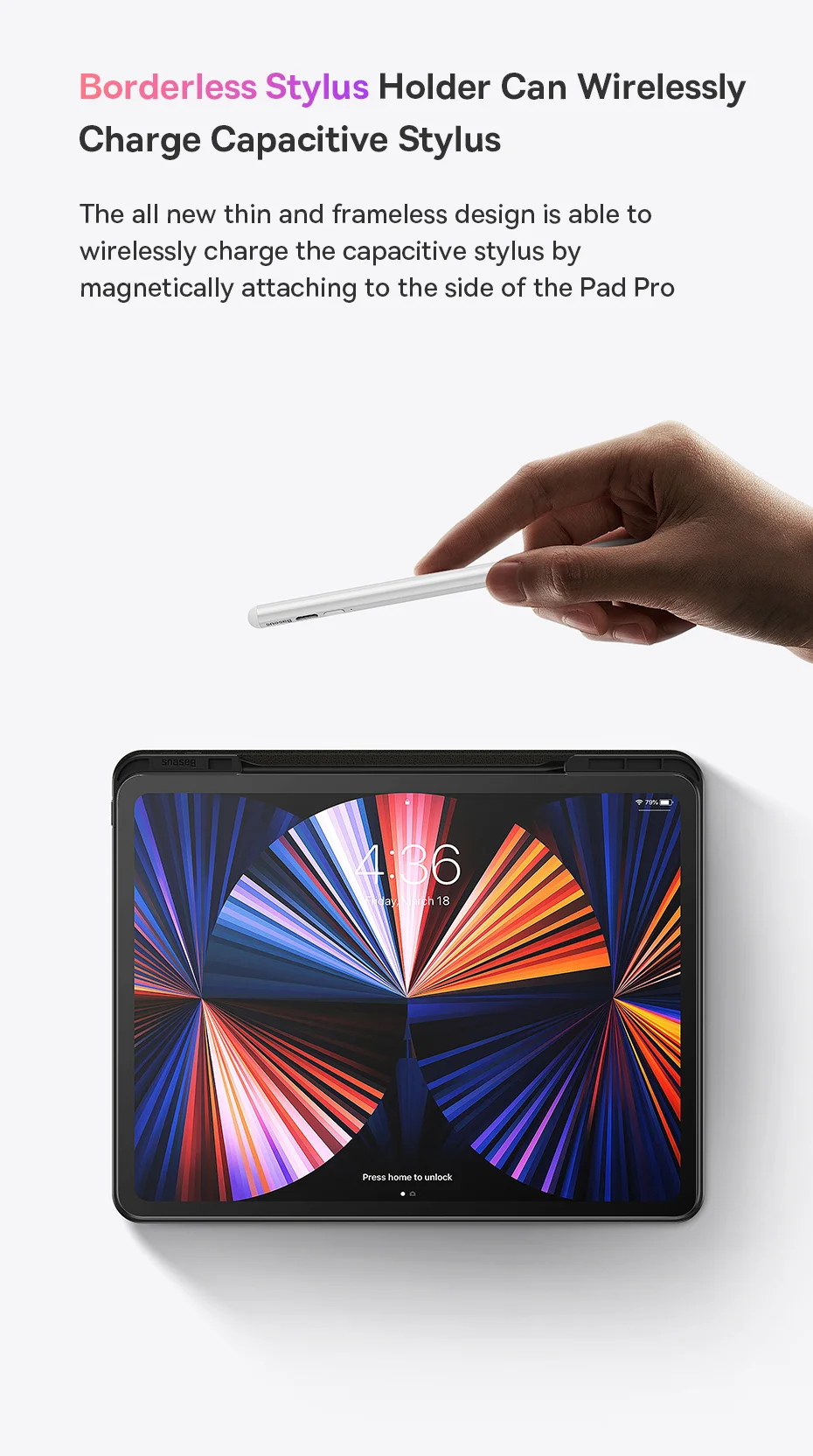 The all new thin and frameless design is able to wirelessly charge the capacitive stylus by magnetically attaching to the side of the Pad Pro