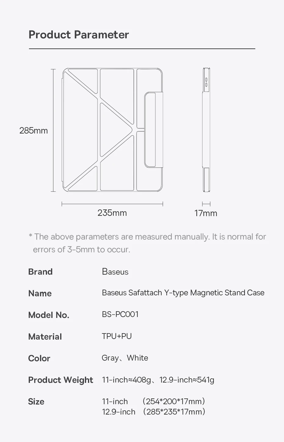 BASEUS Safattach Y-Type Magnetic Stand Case for iPad Pro 11-inch/12.9-inch (2018)/(2020)/(2021) Tri-Fold Tablet Cover PU Leather Protective Case Support Auto Wake/Sleep